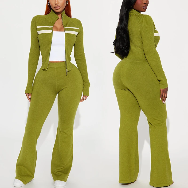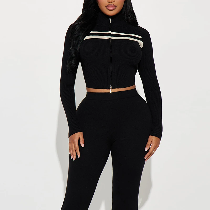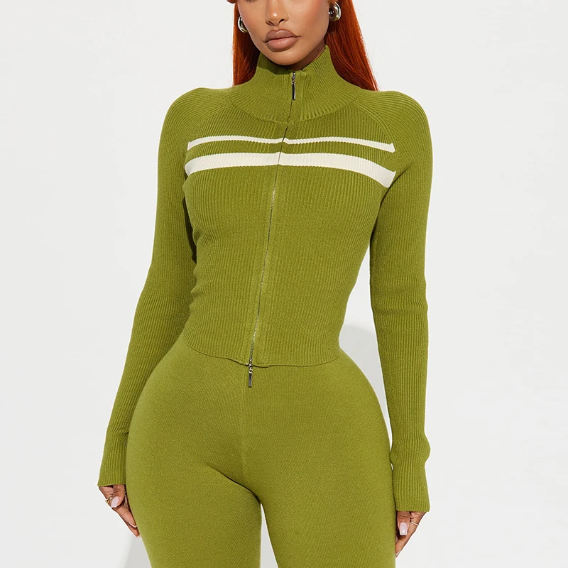 Premium Knitted Women's Winter Tracksuit Set Slim Fit Stand Collar Jacket and Pants with Hoodie Custom Logo Top Clothing